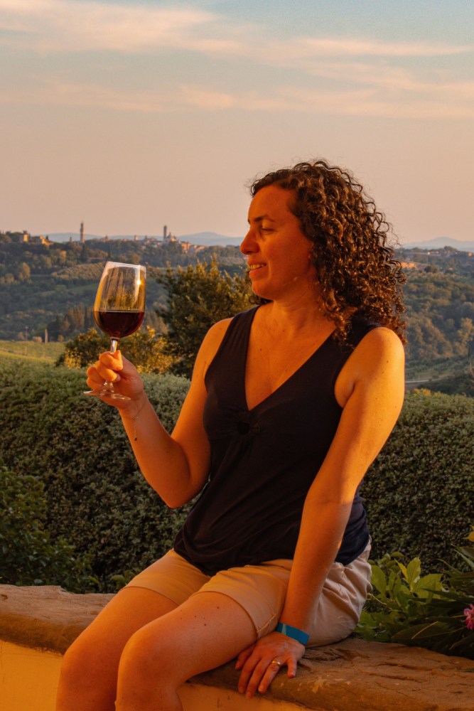 Abbiamo avuto modo di fare una bellissima passeggiata tra i filari, accompagnati da Valeria Losi, bisnipote di Tranquillo Losi, fondatore dell’azienda. Il paesaggio tutto intorno, davvero suggestivo, con Siena e la Torre del Mangia in lontananza e la Certosa alle spalle, ha reso questo momento unico.